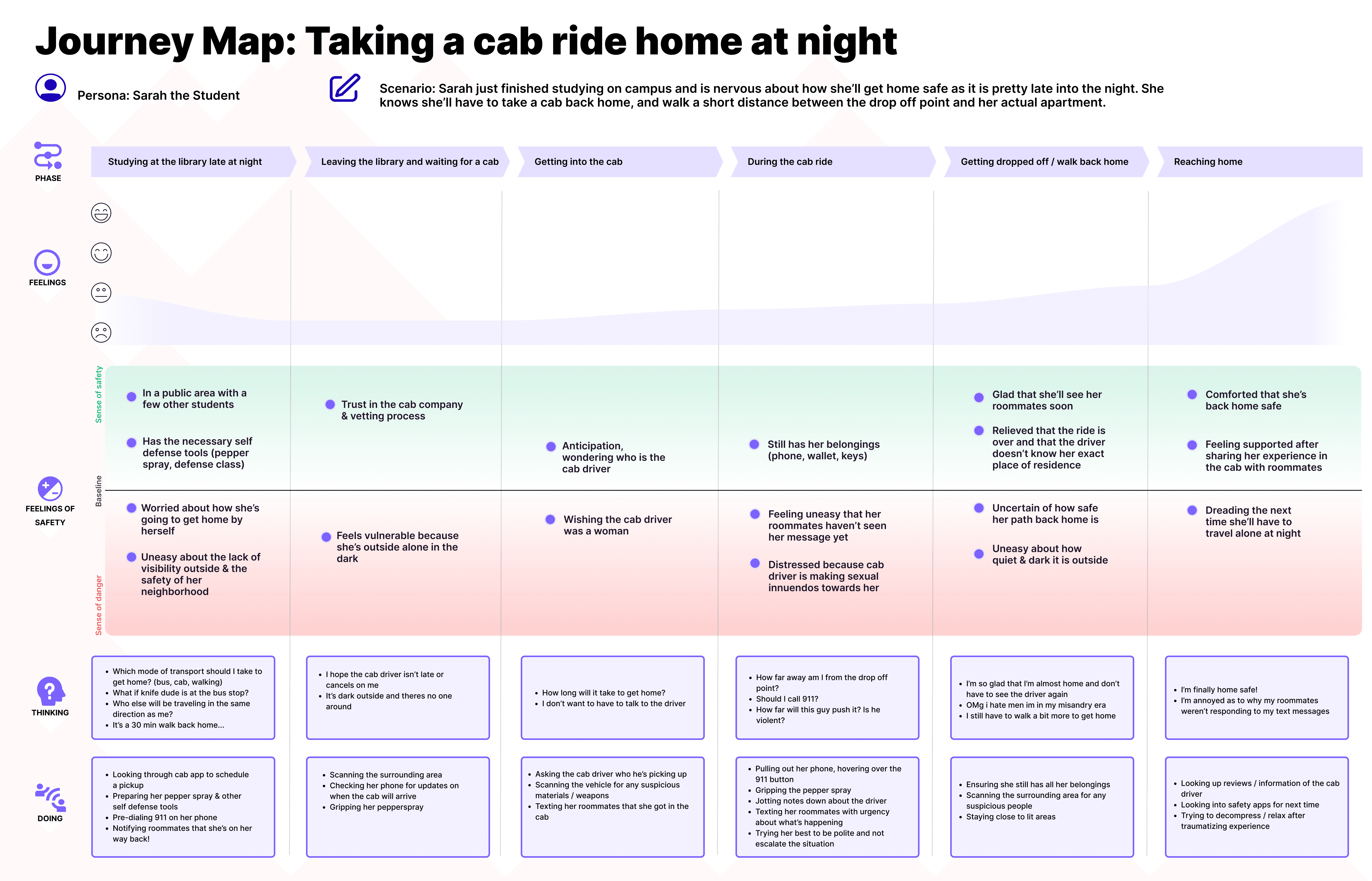 In constructing the user journey map, it became clear that reaching out for support (ie. to family, friends, or emergency services) is not always available or safe, and that feelings of danger are compounded by the feeling of isolation. Additionally, there are often many points where the user can feel threatened and targeted, especially during trips where multiple forms of transportation are used.