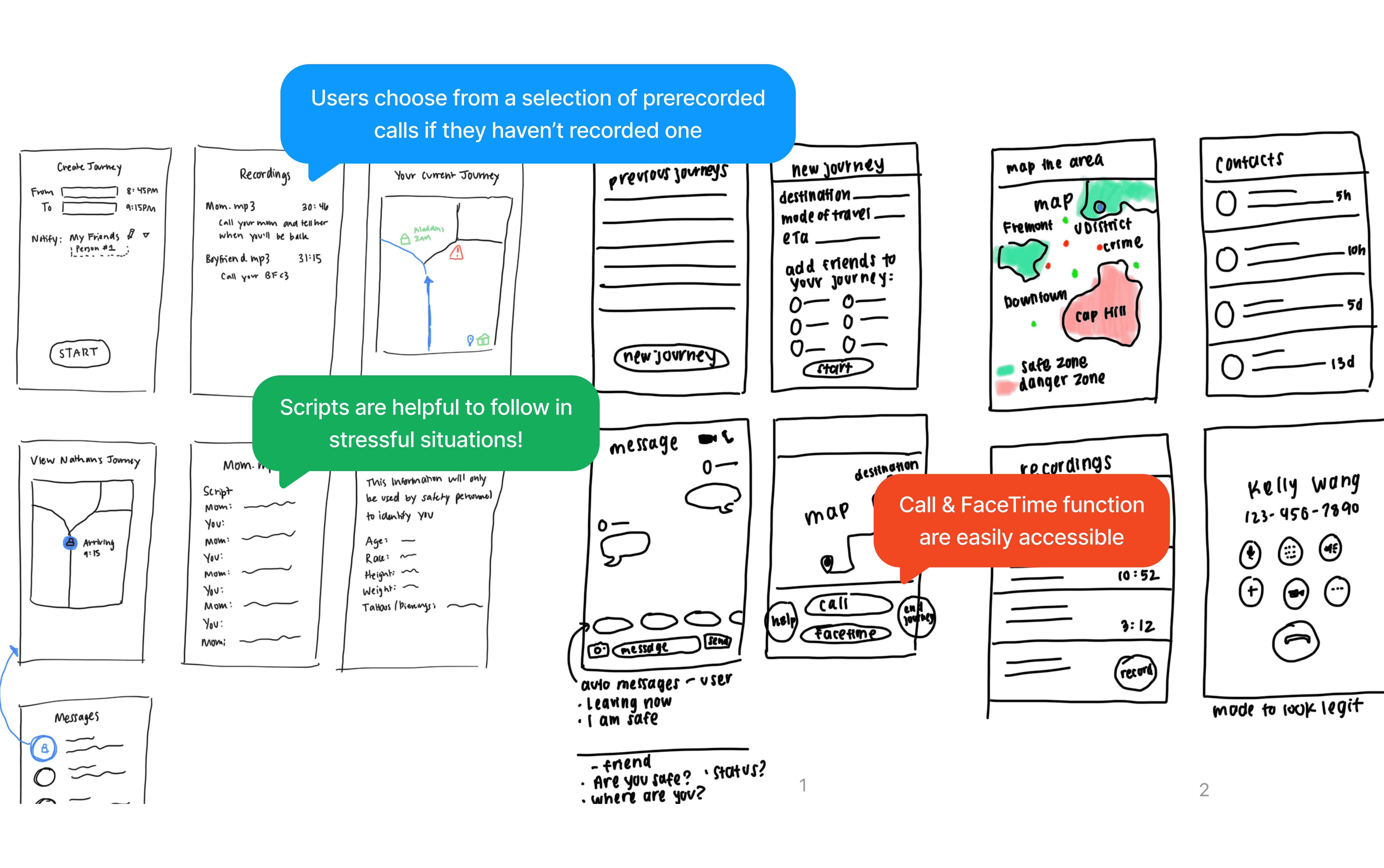 We began sketching out the prerecorded calling feature, and incorporating other standard features of a safety app (map navigation, panic button, chat / contacts, etc).