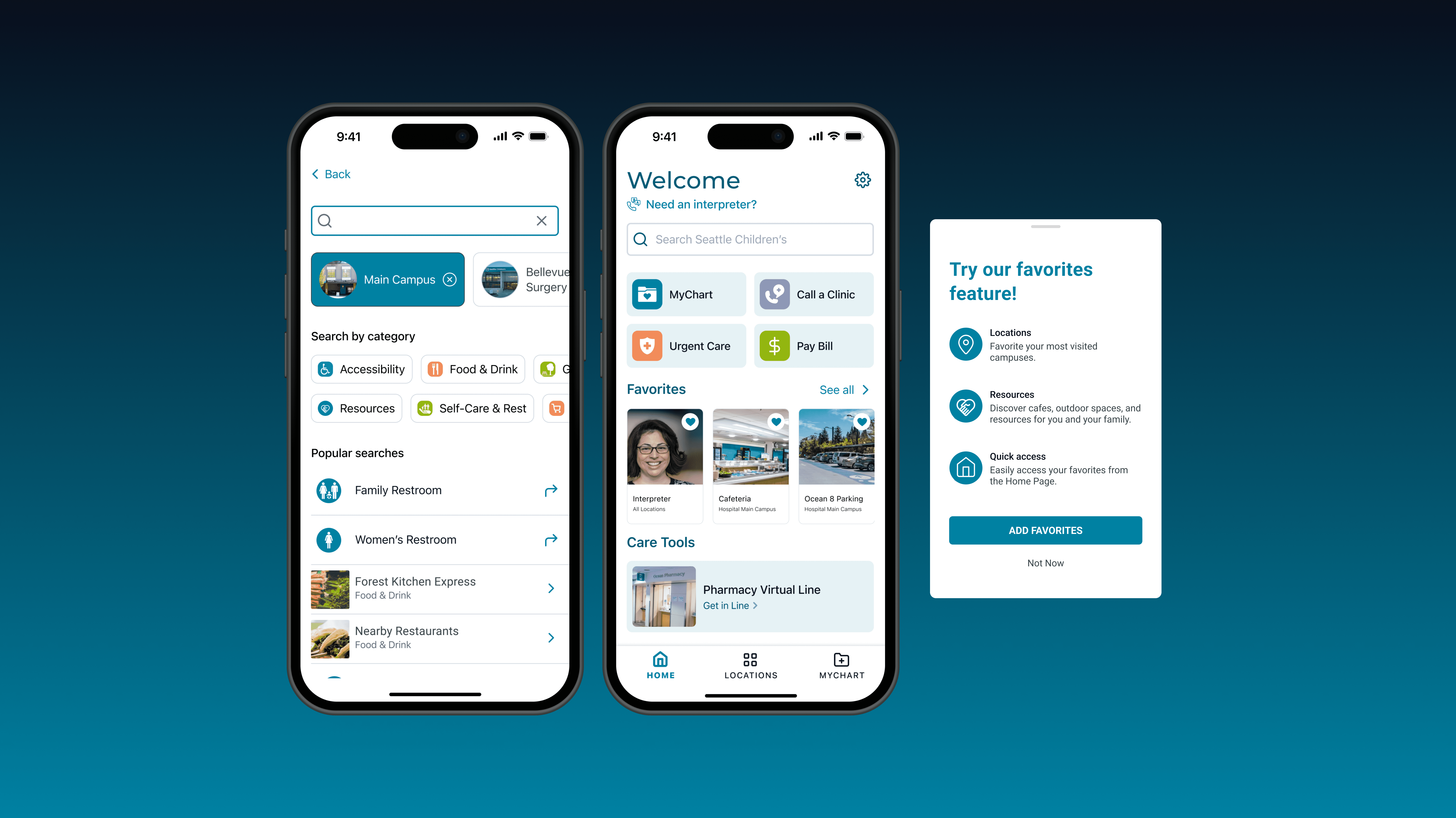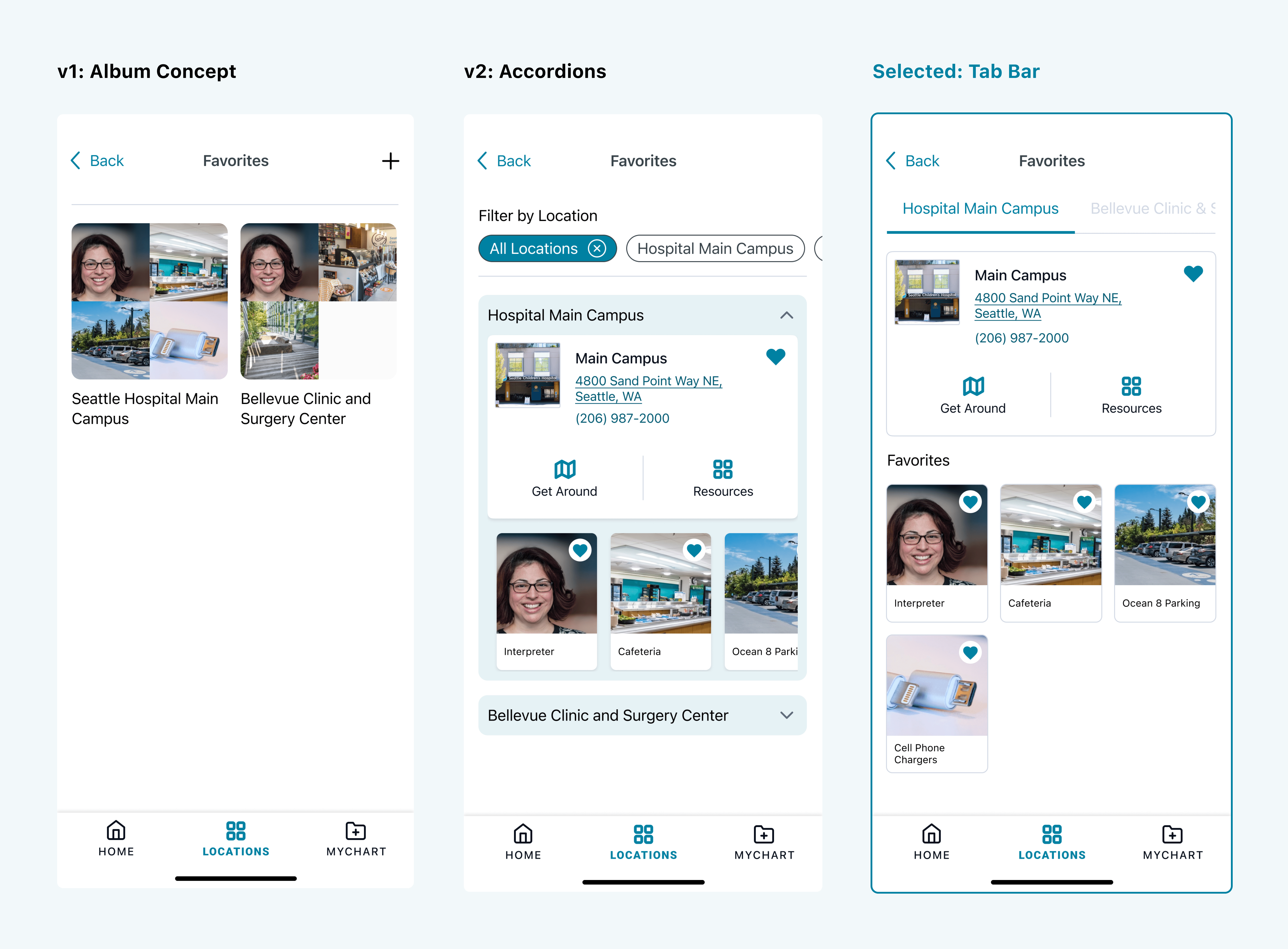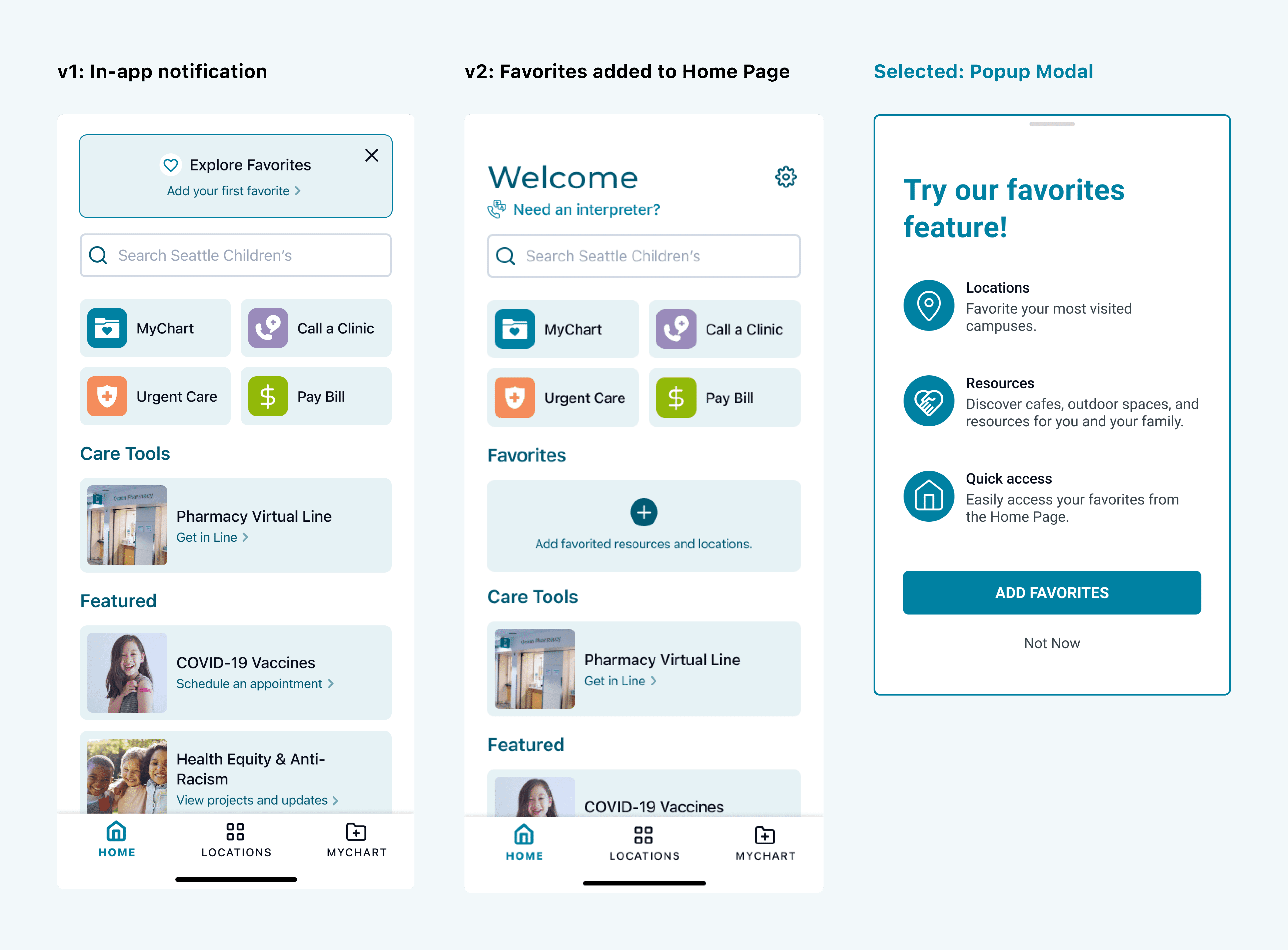 We learned from user interviews that not all users were aware of hospital resources or a favorites feature. I explored multiple ways of introducing the favorites feature to encourage users to discover and save resources.