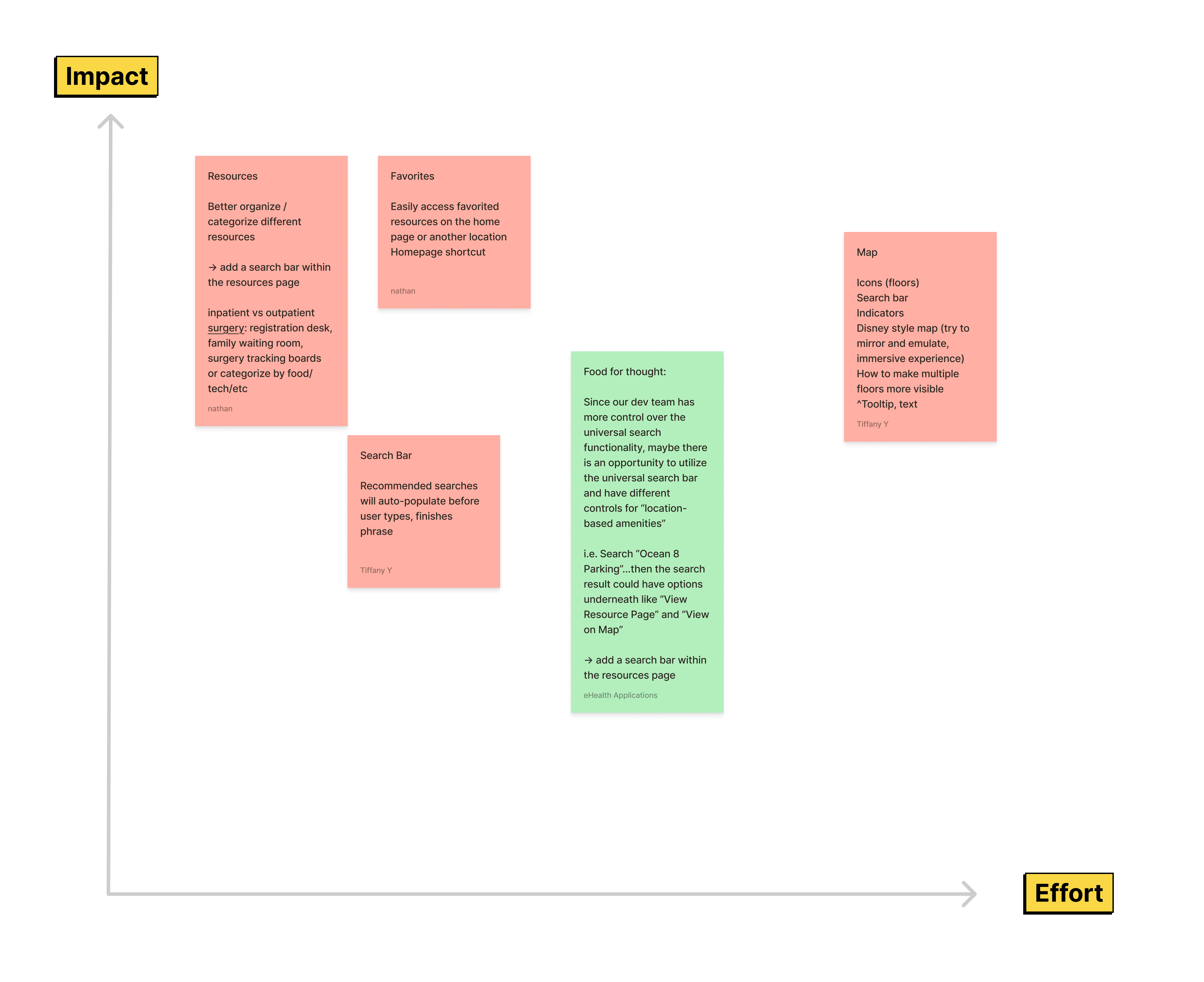 After presenting our findings to the SCH team, we held a collaborative workshop to discuss high-level redesigns our team brainstormed. After ranking by impact and effort, we landed on 3 priorities:
