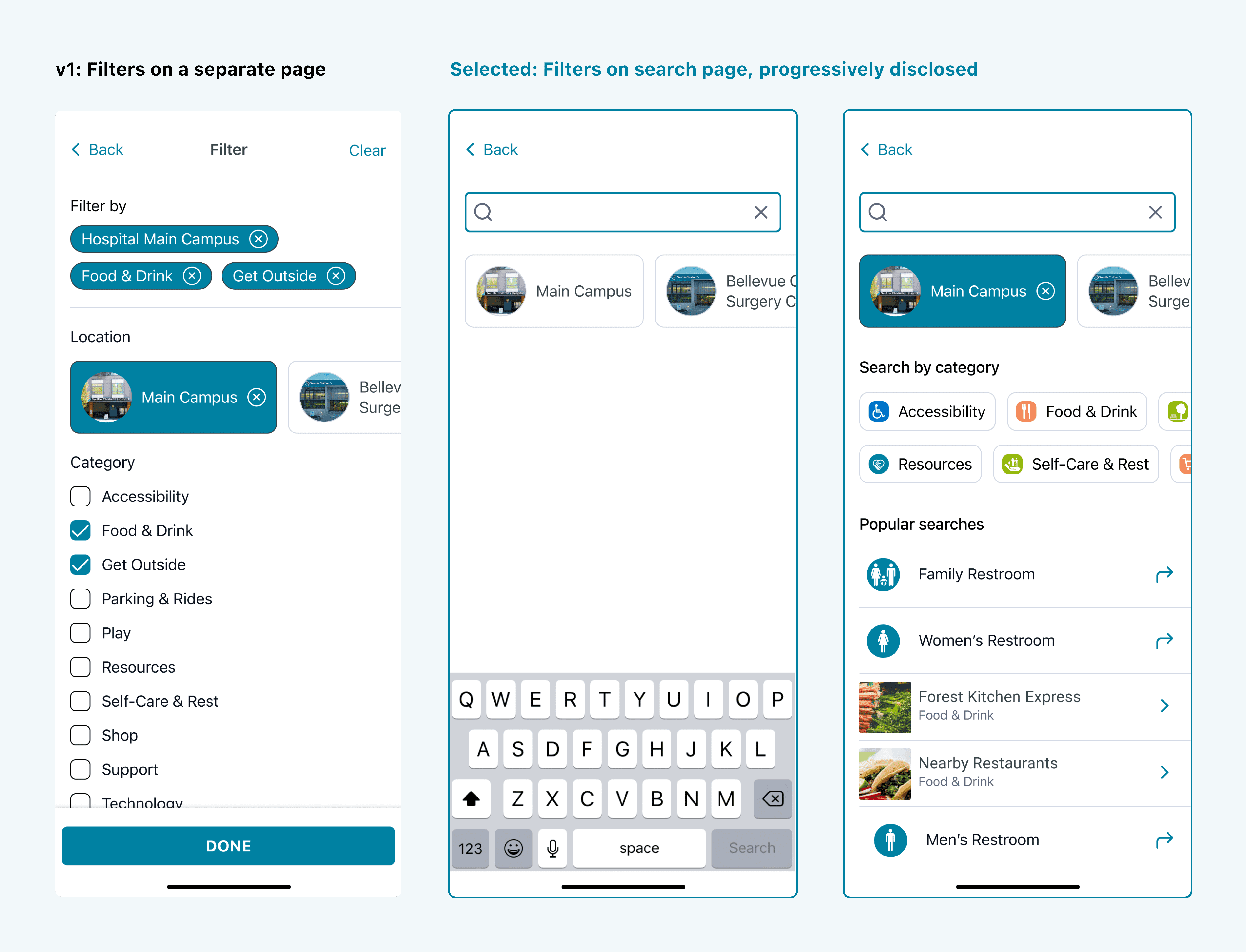 In moments of decision paralysis, I focused on articulating tradeoffs of each solution and keeping our North Star (helping users discover hospital resources) in mind. This process made me a lot more confident in my recommendations to the team, and allowed me to gather feedback for more iterations!